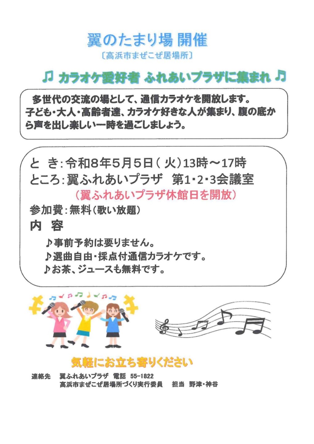 毎月第3日曜日に活動している『翼のたまり場』ですが、5月5日(火)は特別に、通信カラオケの居場所として開放します。